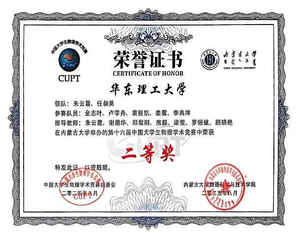 2025年1月,经过线下汇报答辩,最终确定由物理学院2023级学生金志叶(队长)、卢学舟、姜震、袁程凯、李典坤组成代表队参与比赛。后续团队代表我校参与了5月23日至25日于苏州大学举办的华东地区赛,取得了华东赛区一等奖的成绩,时隔4年获得重返国赛现场的机会。
